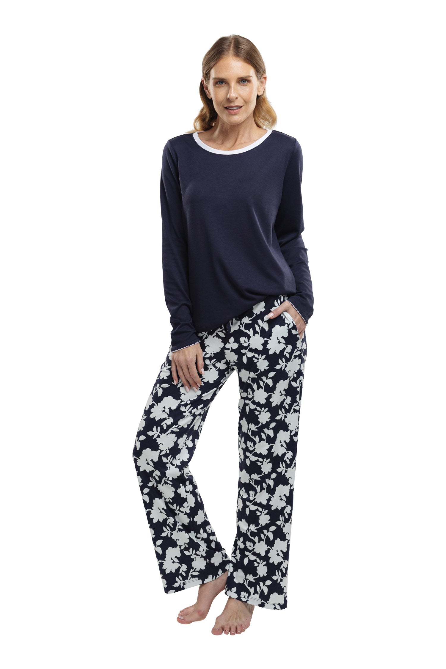This petite-sized pajama set is your perfect companion for comfort. The soft floral print on the bottoms pairs beautifully with the solid navy top, creating a timeless look. Whether you're unwinding indoors or enjoying a quiet moment in the garden, you'll feel at ease in style.
